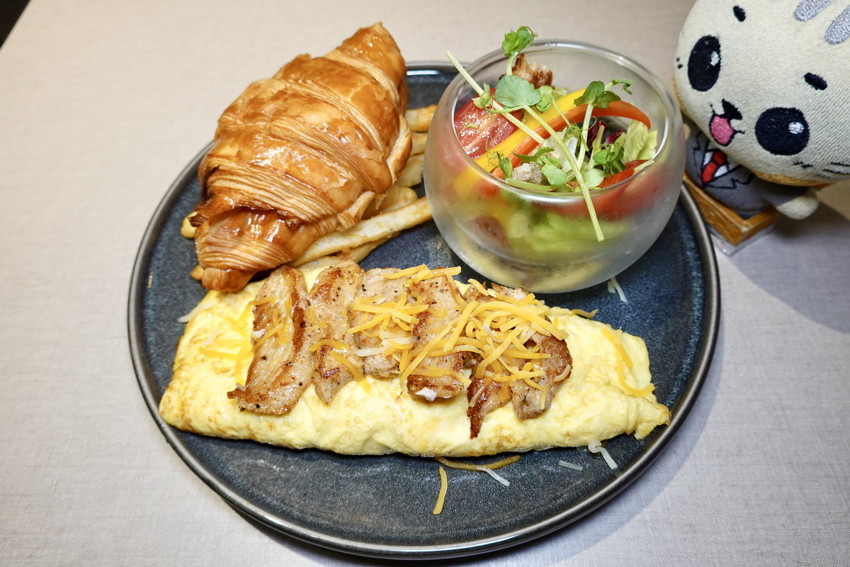 玉子燒歐姆蛋口感是日式玉子燒一般的香濃綿密,裡面還包著起司呢!大可頌品質很不錯,生菜沙拉保水性好,連薯條都很好吃。