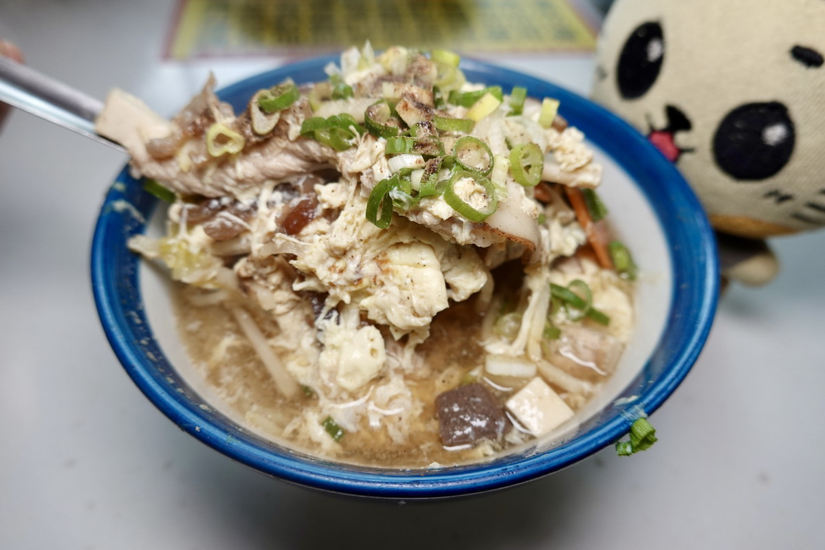 大滷麵是中國北方流行的麵食,將配料煮成一鍋然後勾芡成「滷汁」淋在熟麵上食用。這一碗大滷麵用料超豐富,肉片捨得給,其它還有筍絲、黑木耳、青江菜、豆腐、紅蘿蔔、蛋花等,湯頭勾芡不會太重,調味也清爽,一碗吃下肚真的很飽足。如果怕吃太飽,其實點大滷湯也可以。
